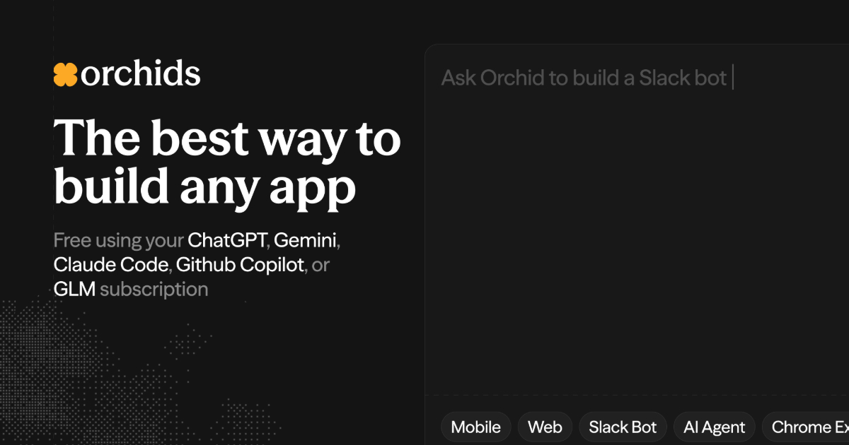 Orchids is the AI-powered IDE for building full-stack apps. Chat to build, see your screen, hear your voice. Download free for Mac, Windows, and Linux.
